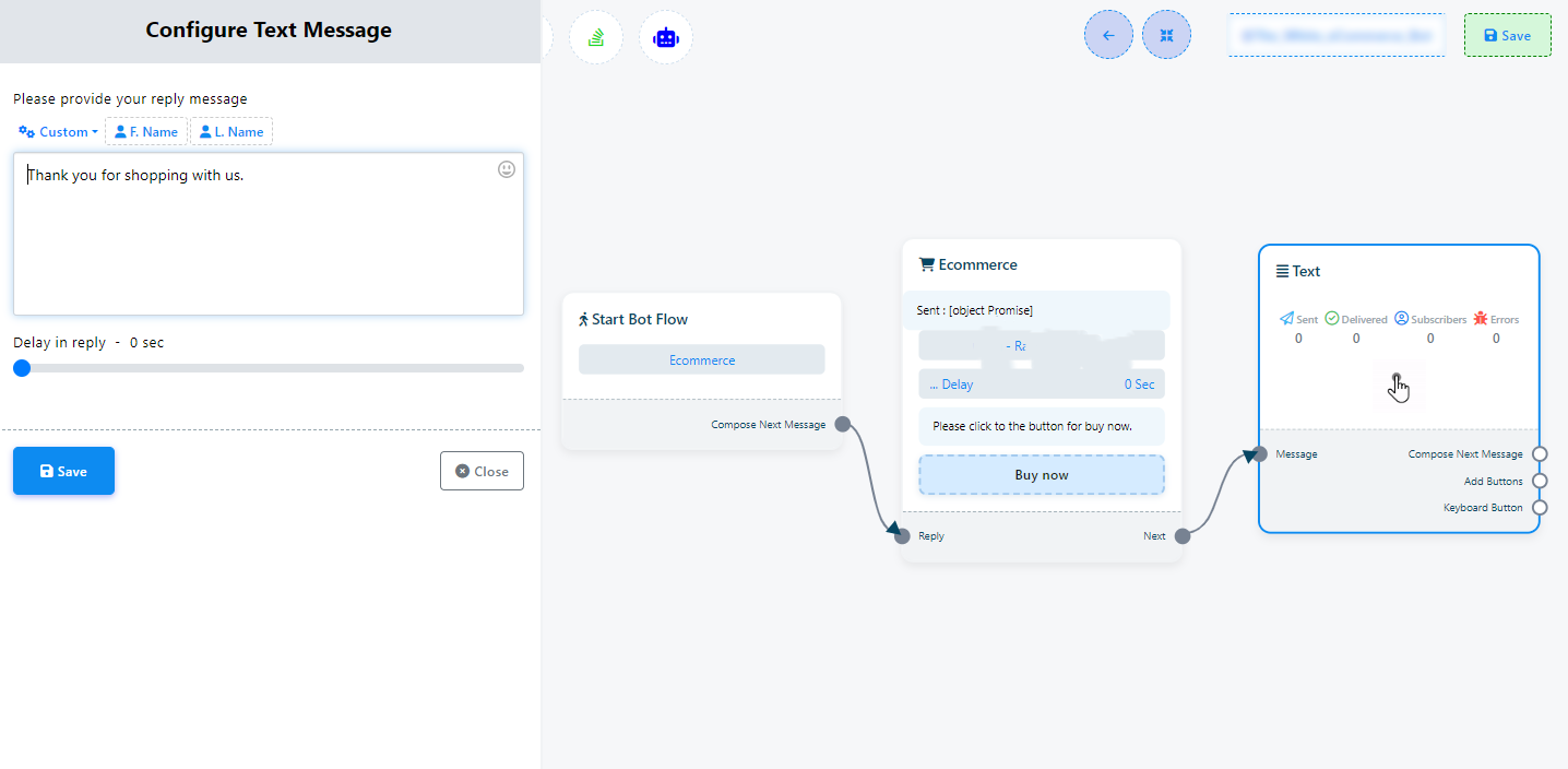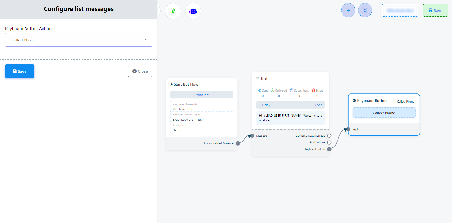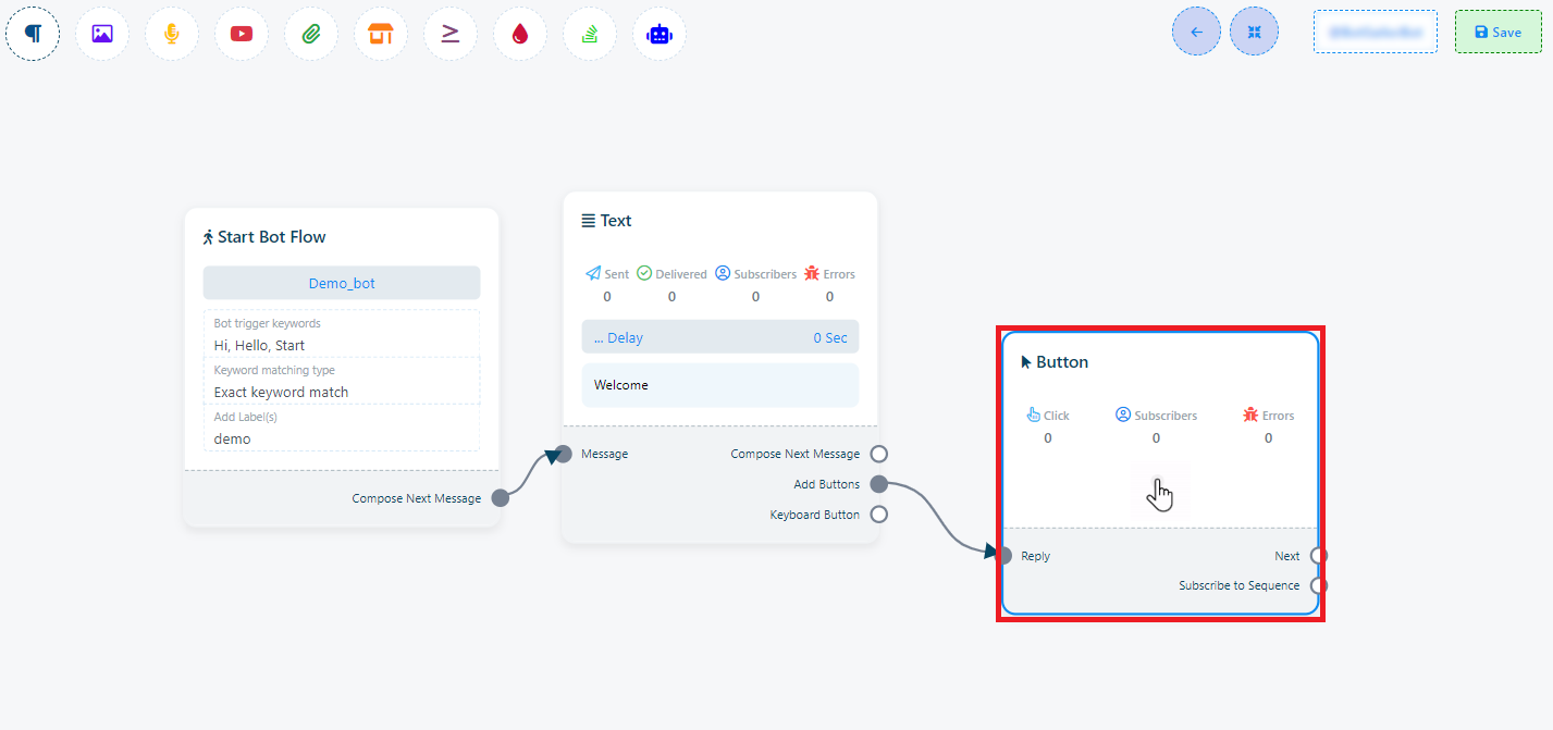 Now click on the Save button and the information will appear on the component. Then connect the text component with the Start bot flow component.