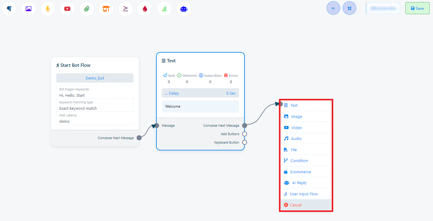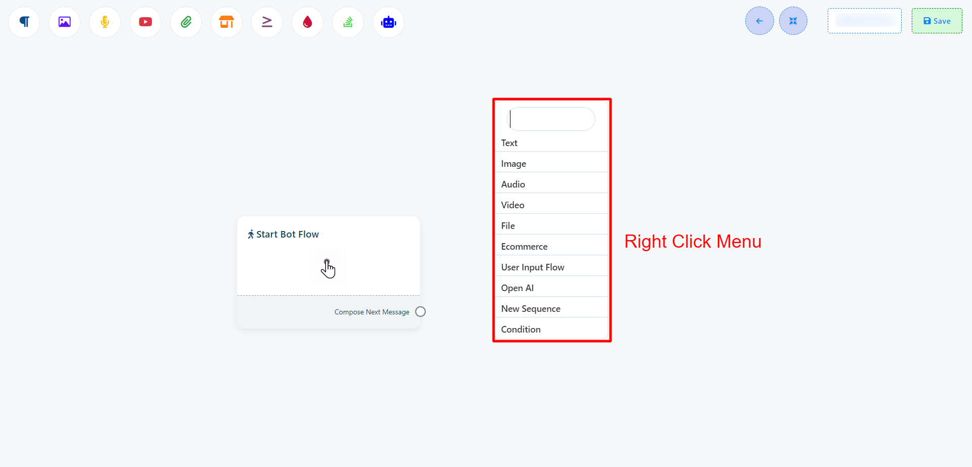 Once you`ve completed the `Start Bot Flow` setup, you`ll see a socket called `Compose Next Message`, These sockets allows you to add various reply components. After adding components, we must configure them accordingly.