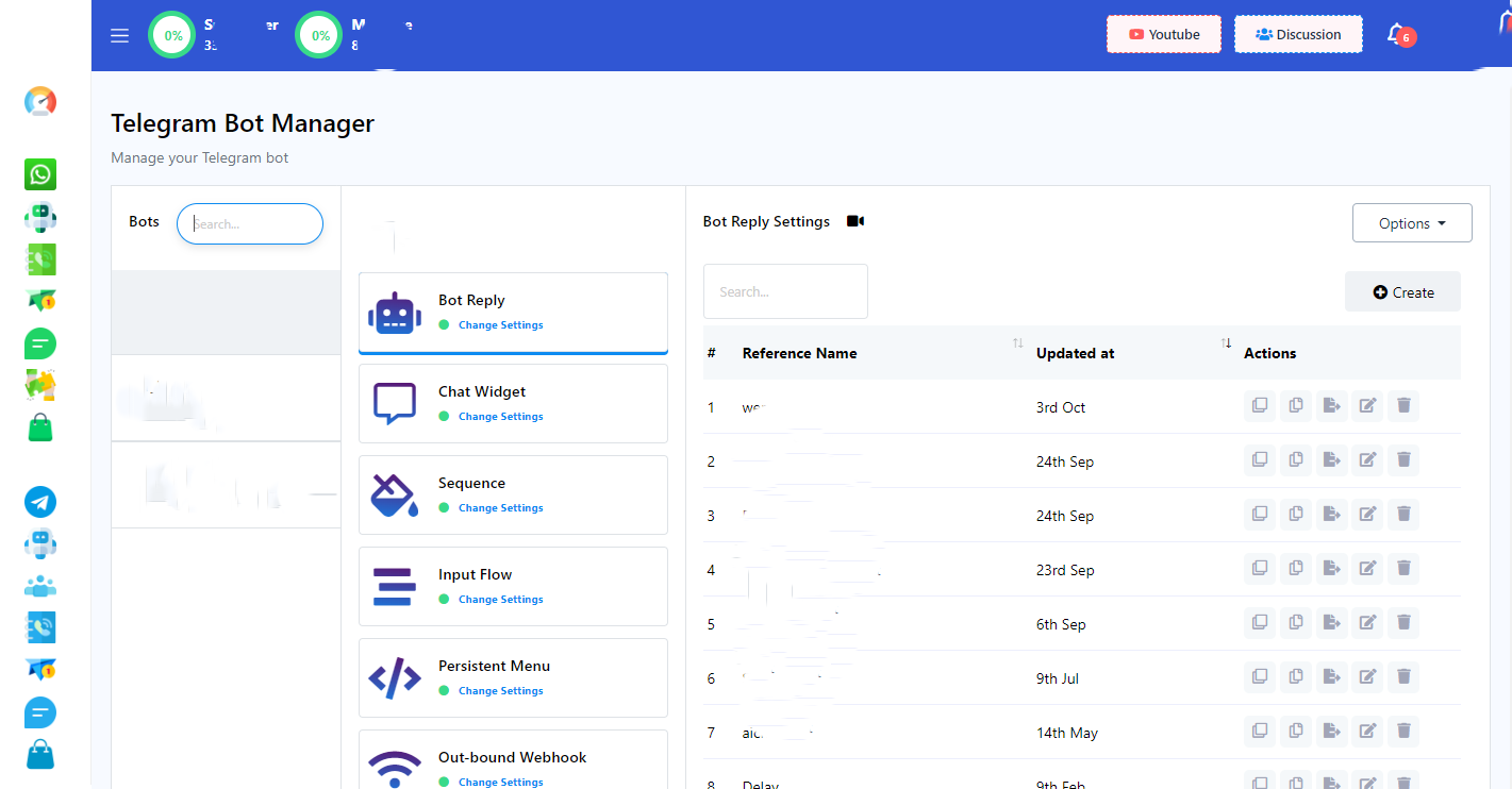 Access the Bot Manager from the dashboard’s left side menu and head to the `Bot Reply` option, there you`ll find a `Create` button located in the upper right-hand corner. To initiate the process of constructing a bot, select the bot account if you have multiple bots connected and then simply click on the `Create` button while ensuring that the `Bot Reply` option is selected.