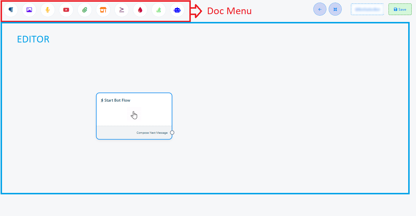 Once you`ve open the Flow Builder, you`ll find that all the components are conveniently consolidated at the upper-left corner of your screen in the `Top menu`. Simultaneously, within the `Editor` section, you`ll notice that the `Start Bot Flow` component is already preloaded for your convenience.