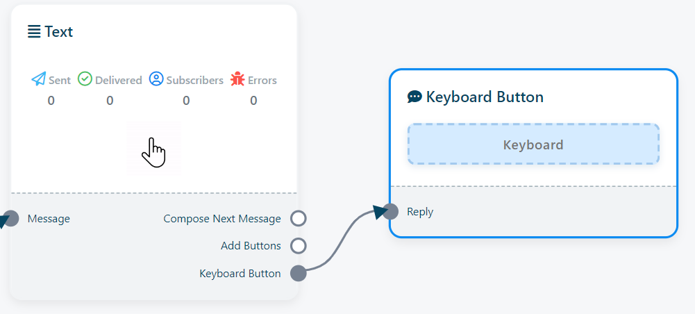 - To include this component, simply drag your cursor from the `keyboard button socket` of Text, Image, Audio, Video, or File components and release it onto the editor. This action will immediately introduce a Keyboard component connected to the parent component.