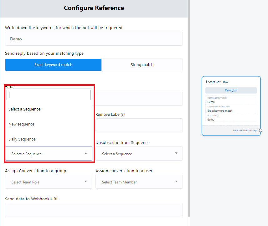 - Keyword Triggering: To initiate the bot using specific keywords, double-click on the `Start Bot Flow` element. This action will open the `Configure Reference` left sidebar, featuring ten fields and two buttons. In the keyword field, add keywords and separate them with commas when you add more than one keyword. When a user enters text in the messaging window that matches any of these keywords, the bot will be activated