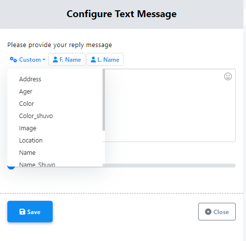 You can also insert custom variables into your reply message. Click the `Custom` button, select a variable from the drop-down menu, and it will be replaced with the actual value before sending the message.