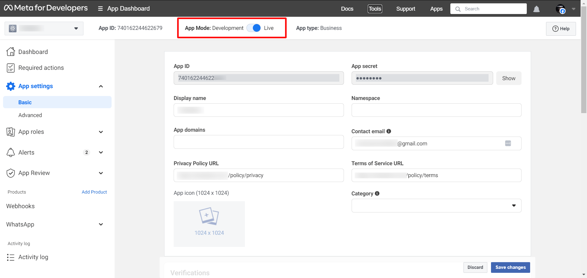 After adding the adding the privacy and terms and condition URLs, just enable the live mode from the developer mode. To do that just click on the toggle button as show below.